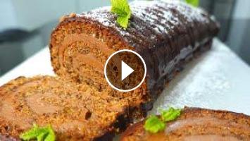 Волшебный бисквитный шоколадный рулет с шоколадным кремом и персиковым джемом.