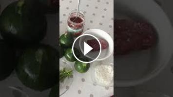 Итак, лук, чеснок натираем на терку ( или пропускаем через мясорубку или блендер) и добавляем к фаршу. Туда же отправляем натертый помидор я использовала вместо помидора ложку томатной пасты (это не позволит рису сильно развариться и начинка будет сочной). Добавляем специи, рис, нарезанную петрушку, оливковое масло и гранатовый сироп все хорошо вымешиваем все начинка готова. Даем начинке постоять минут 15 в это время подготавливаем овощи. Начиняем овощи и отправляем тушиться в томатном соке или в моем случае томатная паста разведенная водой. Обращаю внимание, что фарш должен быть накрыт в моем случае это "крышечка" от кабачка в случае перца, обычного кабачка или баклажанов сверху накрывают кусочками помидора.