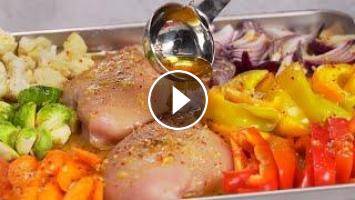 Это замечательное блюдо настолько удобно в приготовлении, что выручит вас в любую минуту, когда гости уже на пороге или в праздничный день, чтобы долго не стоять у плиты. Для его приготовления вам понадобится не больше получаса. Удобно еще и то, что вы можете использовать любые овощи по вашему вкусу и выбору - выложить их, и куриную грудку на противень и отправить в духовку, а перед этим, полить соусом, который и сделает это блюдо идеальным - невероятно вкусным, эффектным и праздничным.