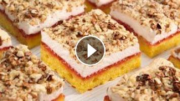 Bake the sponge cake at 180 degrees for 25-30 minutes. Then we smear with strawberry jam, distribute the proteins and bake for another 10-15 minutes at 180 degrees.